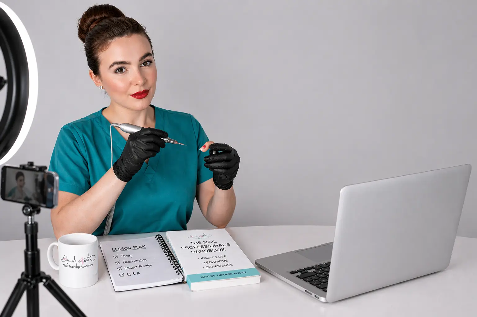 Professional nail educator demonstrating proper technique during structured online nail training course