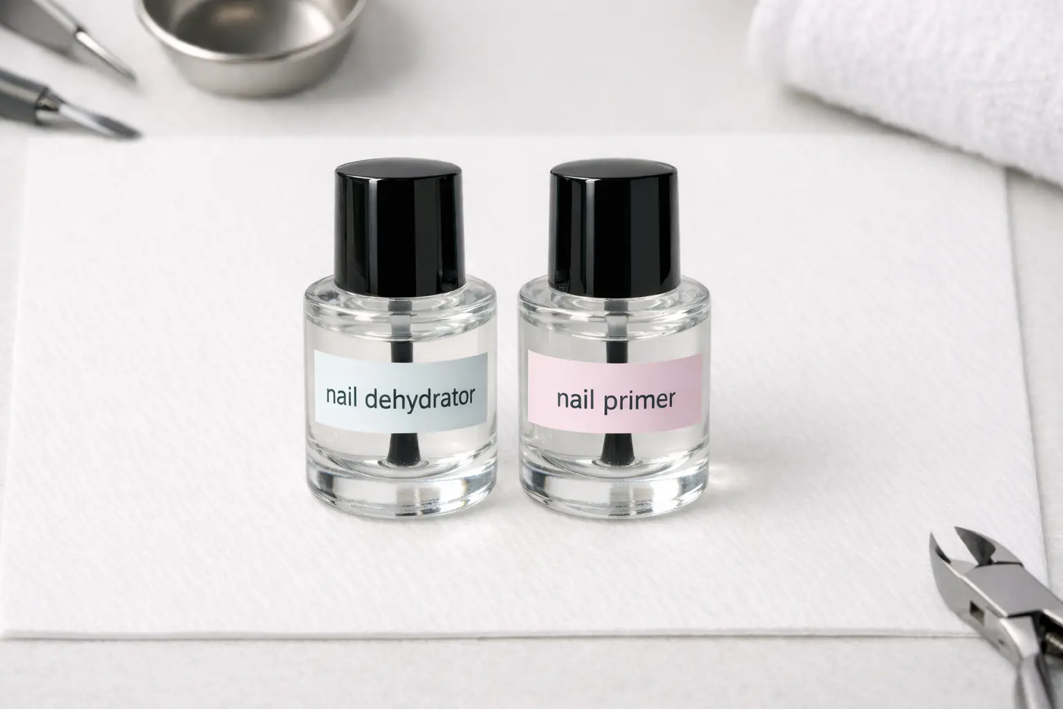Nail dehydrator and nail primer bottles positioned side by side on professional nail preparation station